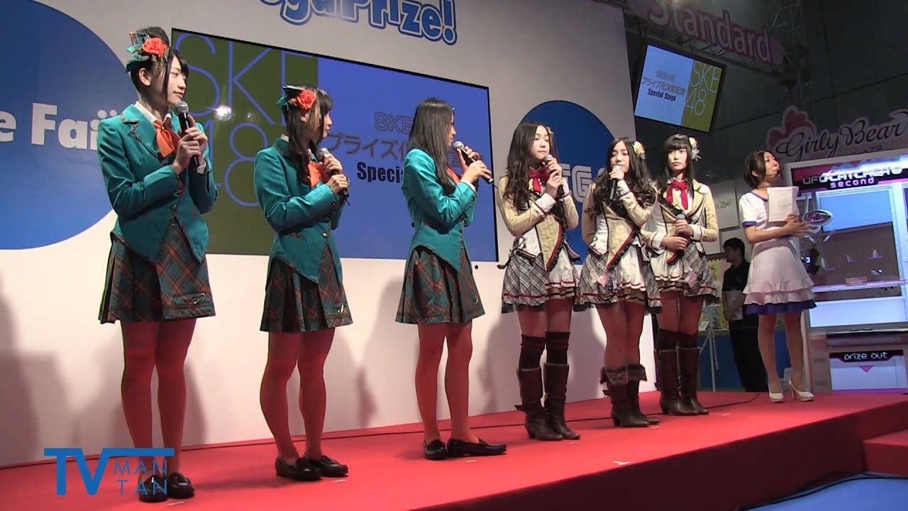 イベントに登場したのは、向田さん、古川さんのほか、石田安奈さん、柴田阿弥さん、小林亜実さん、中村優花さんの6人。SKE48の景品はタオルやフォトケース、衣装ストラップなどで、今後順次全国のゲームセンターなどに展開する予定という。景品を見たメンバーは「かわいい」「ほしい」とお気に入りの様子で、実際に石田さんと柴田さんがステージ上でUFOキャッチャーに挑戦し、2人とも見事一発で成功。「楽しかった」と笑顔で語るメンバーは、「(UFOキャッチャーを)家とレッスン場に1台ずつほしいね」とむちゃな要求をして司会を笑わせていた。