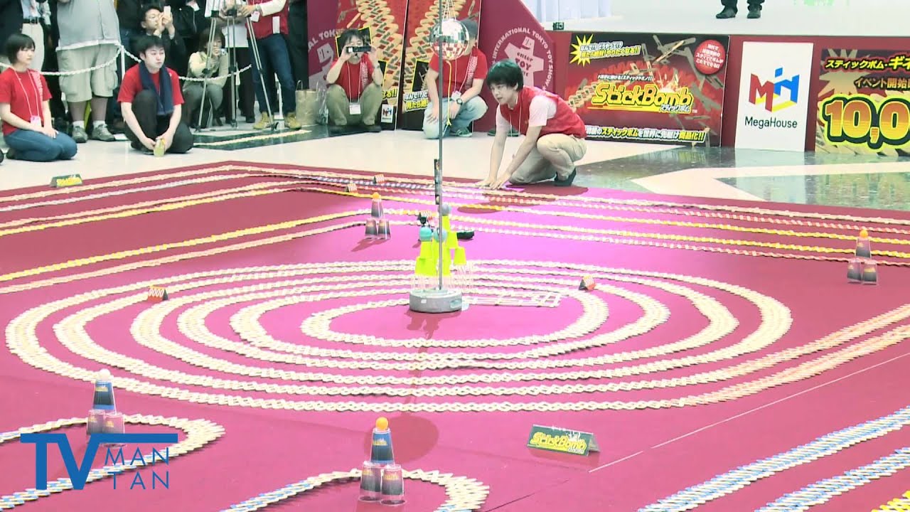 はじけ飛びながら連鎖して崩れる新感覚のドミノ「スティックボム」(メガハウス)で、米国人男性が持つギネス記録3864本(6月6日現在)更新に挑戦するイベントが14日、東京ビッグサイト(東京都江東区)で開催中の「東京おもちゃショー2012」内で行われ、9911本の連鎖を達成した。