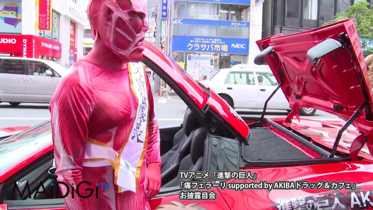 諫山創さんの人気マンガが原作のテレビアニメ「進撃の巨人」の超大型巨人などが描かれた“痛フェラーリ”が17日、東京・秋葉原のAKIBAドラッグ&カフェでお披露目された。同日発売のアニメのブルーレイディスク(BD)とDVDの1巻の発売を記念してラッピングされたもので、車体は約4000万円のフェラーリの458スパイダー。制作費は約60万円。