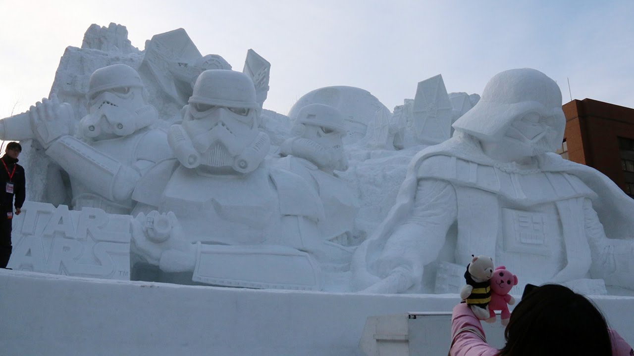 大通西4丁目「STV広場」に展示された「雪のスター・ウォーズ」の雪像は、高さ15メートル、幅22.6メートル、奥行き20メートルの巨大サイズで、大通り公園会場の雪像としては最大級。5トントラックで700台分の雪を使い、のべ2000人が制作に携わった。映画「スター・ウォーズ」シリーズの象徴ともいえるキャラクター「ダース・ベイダー」や、帝国軍の歩兵「ストーム・トルーパー」、帝国の戦闘機「タイファイター」、宇宙要塞(ようさい)「デス・スター」が迫力満点の雪像となって姿を現している。
