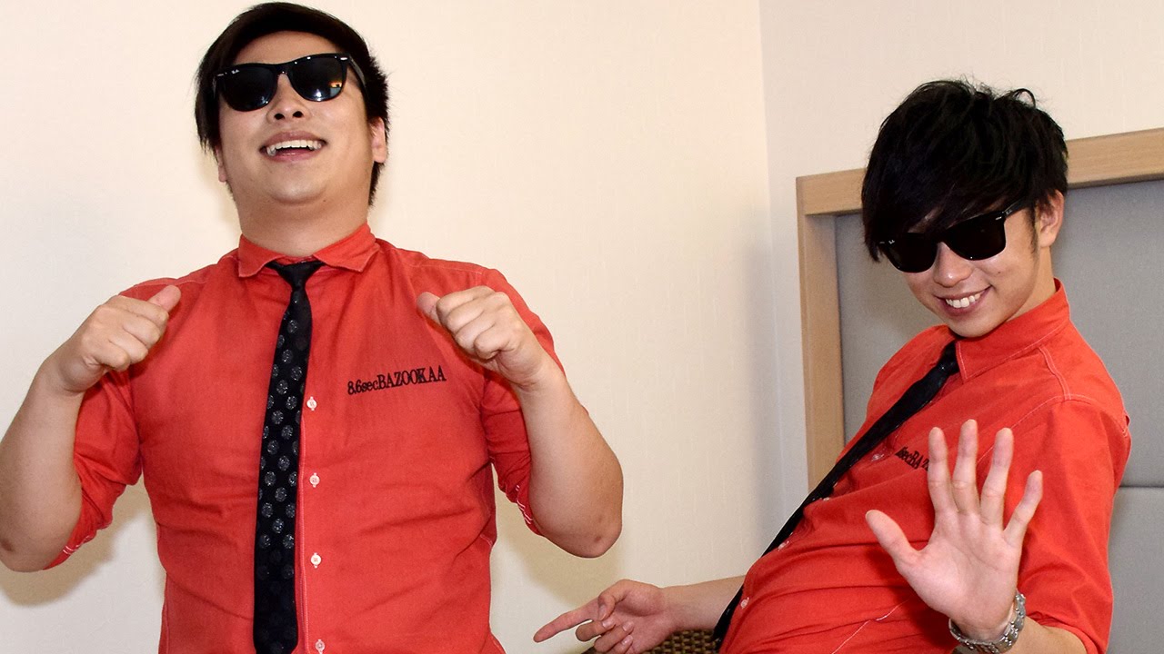 リズムネタ「ラッスンゴレライ」でブレーク中のお笑いコンビ「8.6秒バズーカー」(ハチロク)が26日に沖縄から生放送されるバラエティー番組「ダウンタウンDXDX」(読売テレビ、日本テレビ系)に初出演するのを前に、まんたんウェブの独占取材に応じた。39時間不眠で話題になった超多忙の2人だが、沖縄の立ち飲み屋に2人で飲みに行ったといい、「1年前に芸人をやめようかと話をした時以来です」と明かし、「憧れのダウンタウンDXに出られるなんて夢のよう」と語った。
