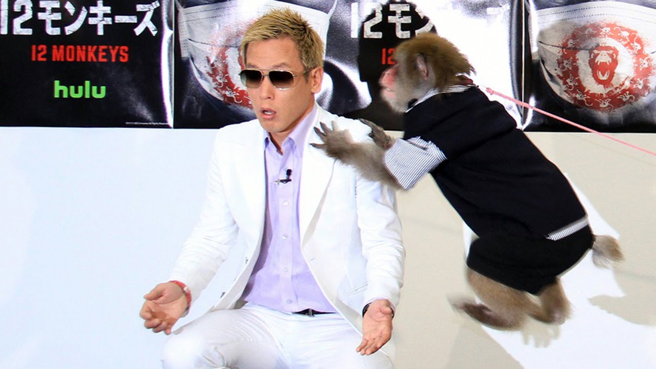 サッカー日本代表の本田圭佑選手のものまね芸で「R−1ぐらんぷり2015」を優勝したお笑いタレントのじゅんいちダビッドソンさんが14日、東京都内で行われた海外ドラマ「12モンキーズ」の大ヒット記念イベントに、“猿まわし”芸人のゆりありくさんと登場。トーク中に、ニホンザルのりくくんから威嚇され、おじ気づいたじゅんいちダビッドソンさんは「台本通りにいかないです」と話し「これだけやられると素に戻ります……」とネタどころではなくなってしまった。