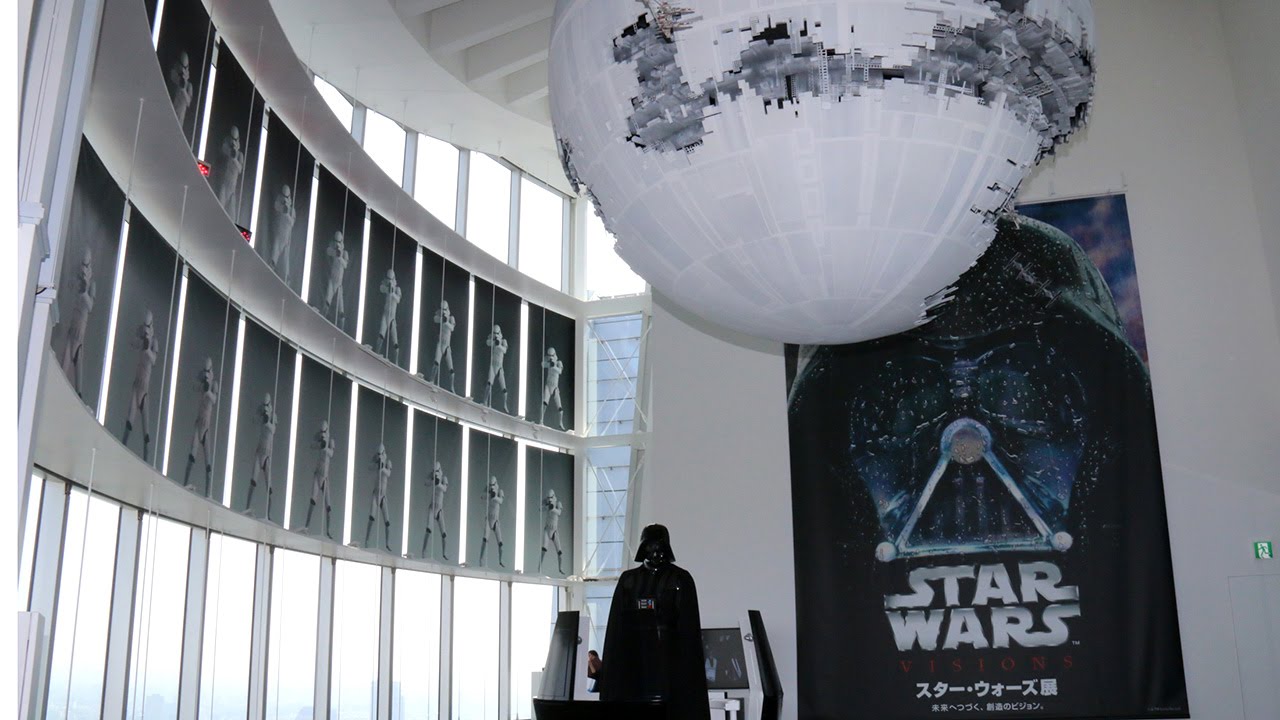 メインエントランスでは、「スター・ウォーズ」シリーズの象徴ともいえるキャラクター「ダース・ベイダー」のフィギュアと、巨大な宇宙要塞(ようさい)「デス・スター」、ダース・ベイダーの顔を大きくデザインした同展の巨大ビジュアルが出迎える。エントランスの窓には帝国軍の歩兵「ストーム・トルーパー」の写真が並ぶ。さらに、約15分間に1度、映画の音楽が流れ、光の演出とともに期待感を盛り上げる。