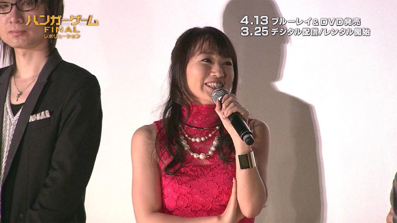 映像は、同作の劇場公開時(2015年11月)に行われた舞台あいさつの模様で、主人公カットニスの声を担当した水樹さんのほか、ピータ役の声優の神谷浩史さん、フィニック役の前野智昭さんも登場し、映画についてのエピソードが語られている。水樹さんは自身の役柄を振り返り、「やっぱり一番イケメンなのはカットニスだなって思いながら最後まで演じさせていただきました」と話している。