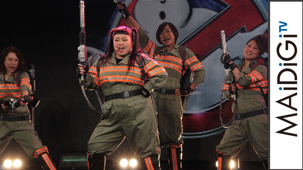 お笑いタレントの友近さん、椿鬼奴さん、渡辺直美さん、お笑いコンビの「南海キャンディーズ」の山崎静代さんが26日、東京都内で行われた映画「ゴーストバスターズ」(ポール・フェイグ監督)のイベントに登場。映画でおなじみのつなぎにゴースト捕獲装置「プロトンパック」を背負ったスタイルで、日本語吹き替え版主題歌を披露した。