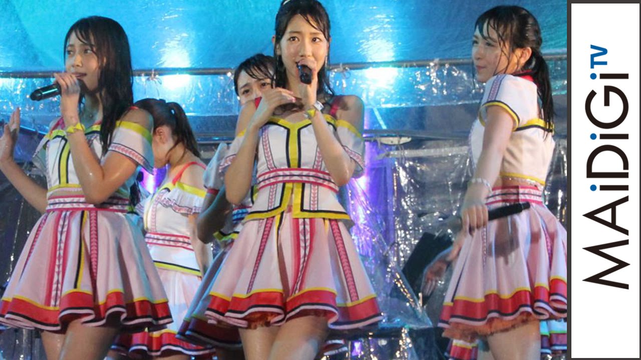 パフォーマンスの合間のMCで、横山由依さんは、降りやまない雨に「(メンバーの中に)ゆきりんという雨女がいまして……」と苦笑い。雨の犯人にされてしまった柏木由紀さんは「え、ちょっと!」と戸惑いの顔を見せたが、ラスト曲の「僕の打ち上げ花火」直前には雨が上がり、柏木さんは「なんと雨がやみましたよ!」と満面の笑み。メンバーも口々に「晴れた~!」と喜び、ライブの終わりには観客から「(雨の中)ありがとう!」の声援とともに大きな拍手を送られていた。
