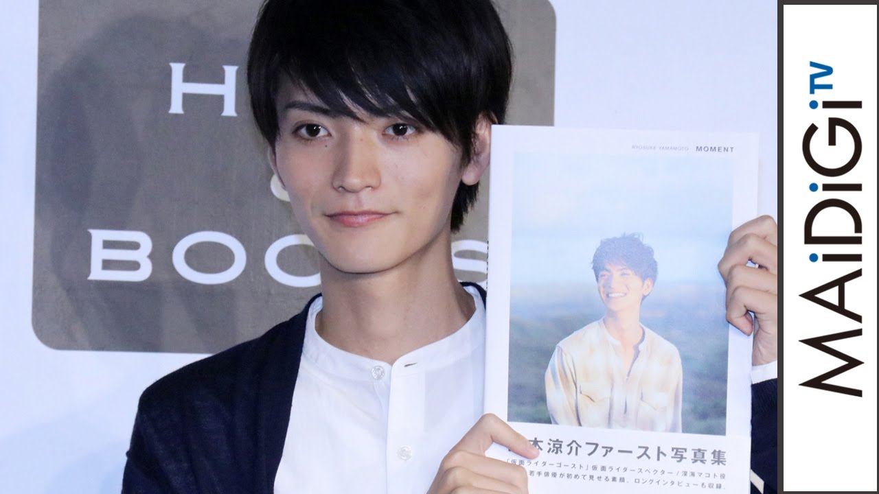 特撮ドラマ「仮面ライダーゴースト」(テレビ朝日系)で仮面ライダースペクター/深海マコトを演じ、ファッション誌「「MEN’S NON-NO」専属モデルとしても活躍する俳優の山本涼介さんが25日、東京都内で初の写真集「MOMENT」(東京ニュース通信社)の発売記念イベントを開催した。「水着のカットだったり、夜の街に繰り出したり、お酒飲みながらとか、大人っぽい写真もある」と、PRする山本さんだが、写真を見て「僕、最初こんなに脱ぐつもりじゃなかったんですけれど、カメラマンさんがすごく乗せ上手で、気づいたら裸」と苦笑い。それでも「21歳の僕がふんだんに詰まっています」と自信を見せた。