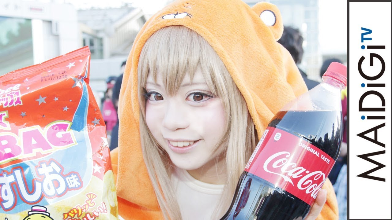 うまるは、見た目は完璧美少女だが、家に帰るとダラダラとゲームをしたり、大好きなものを食べながらグータラ過ごすというキャラクター。今回のコミケでも、うまるに扮し、ポテトチップスの袋やコカコーラのペットボトルを手にしたコスプレが見られた。中には、ビニールシートを敷いて、座りながらグータラ過ごすコスプレーヤーもいた。