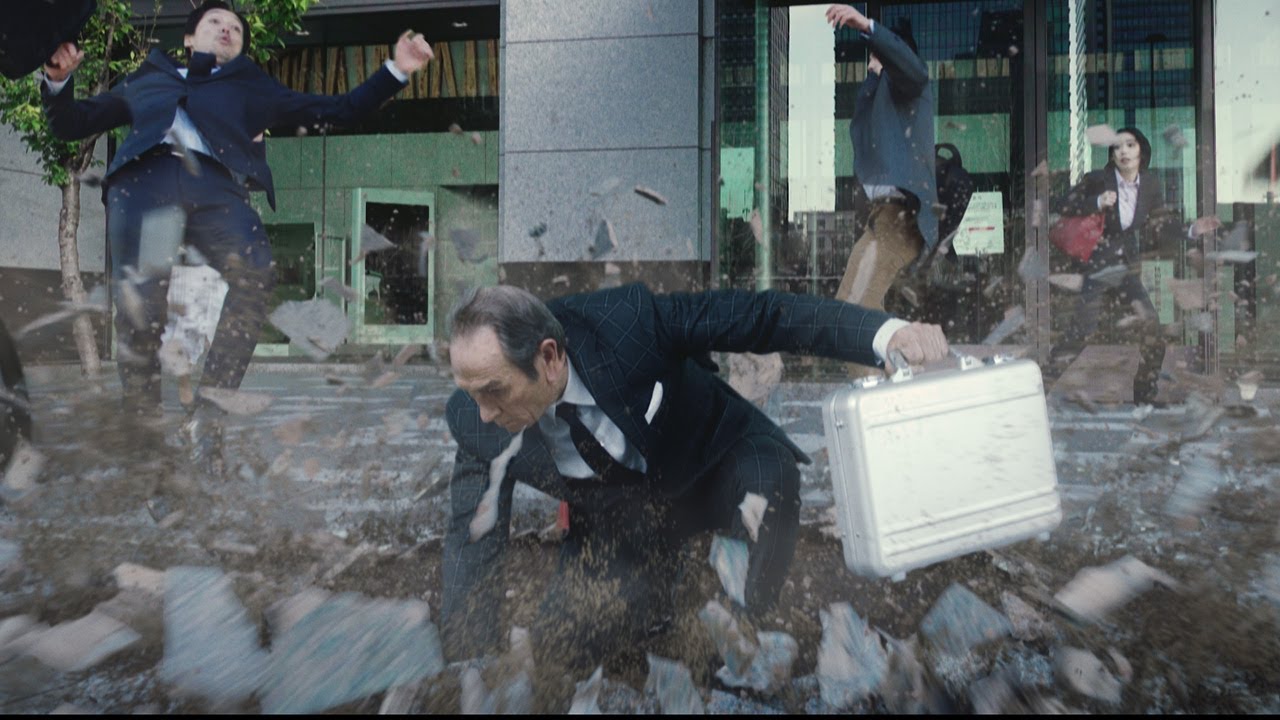 「宇宙人ジョーンズ・いつもと違う」編は、とあるオフィスが舞台。得意先との会議に遅刻しそうになった会社員役のジョーンズさんが、同僚役の滝藤さんに見送られながら、部屋の窓ガラスを突き破る場面からスタート。まるでスーパーヒーローのように、ビルの4階から外へ飛び出し、華麗なポーズで着地。通りかかったタクシーのルーフにしがみつくも落下してしまう。しかし、ジョーンズさんはタクシーの車体につかまり、サーフボードのようにアタッシュケースに乗っている。