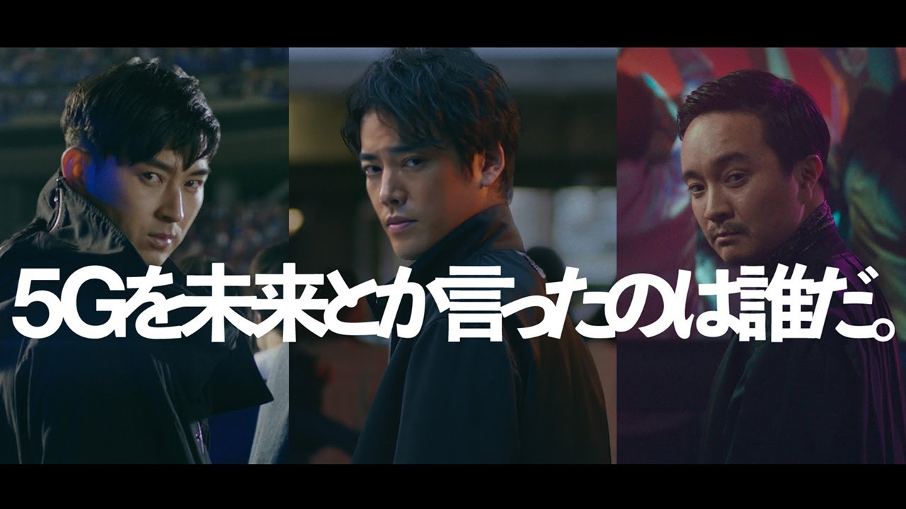 CMは、マツダがサッカースタジアムで試合の臨場感を味わい、キリタニが近未来SFの世界のような街の景色に圧倒され、ハマダがライブを楽しむ様子が描かれるが、実はすべて5G端末での映像体験だった……という内容。近未来SFの世界には、「攻殻機動隊」シリーズに登場するタチコマが、高速道路を猛スピードで走り抜ける姿も描かれている。