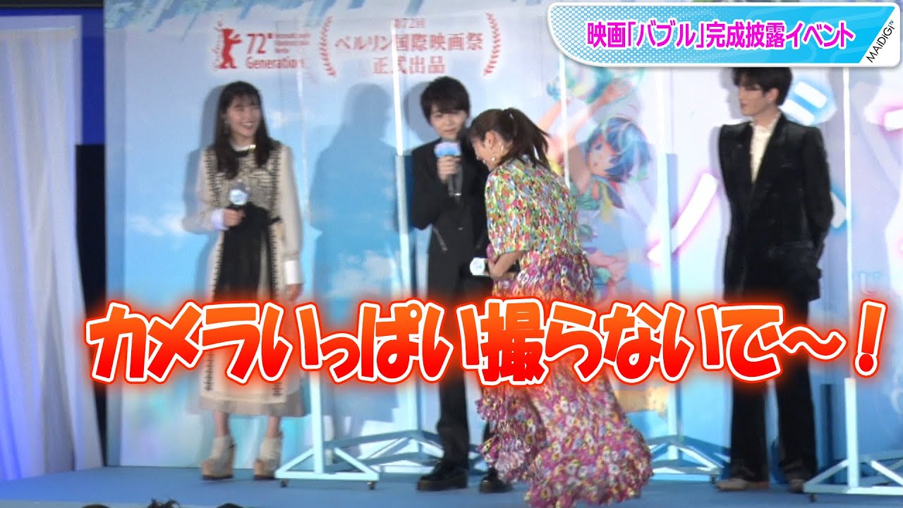 アニメ「進撃の巨人」などの荒木哲郎監督の劇場版オリジナルアニメ「バブル」(5月13日公開)の完成披露イベントが4月7日、丸の内ピカデリー(東京都千代田区)で行われ、主人公・ヒビキ役の志尊淳さん、世界に降り注いだ泡(バブル)を調査する科学者・マコト役の広瀬アリスさんら声優陣が登場した。