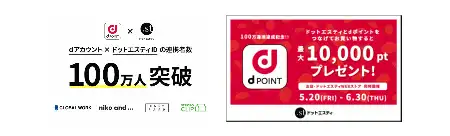 株式会社NTTドコモ(以下、ドコモ)は、ドコモが提供する「dアカウント®」と株式会社アダストリア(以下、アダストリア)が提供する「ドットエスティID」の連携者数が100万人を突破したことを記念して、「ドットエスティとdポイントをつなげてお買い物すると最大10,000ptプレゼント!」キャンペーンを、2022年5月20日(金)から開催いたします。