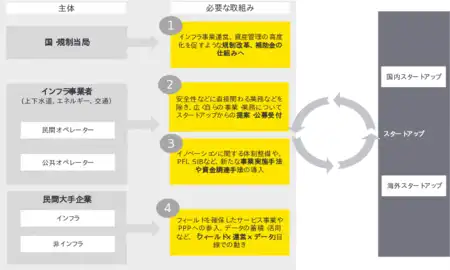 ・今後インフラ分野でのスタートアップ企業活用をさらに推進するためには、政策サイドから各企業の取り組みに至るまで、複数主体における規制、情報やフィールドの開放、体制整備が不可欠だと考えられます。