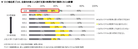 EYが6月に実施したオンライン調査によると、全国を対象とした旅行支援が再開された場合の旅行意欲については、リスク許容者ほど高く、全体として16ポイント程度の需要押し上げの効果が見込まれます。