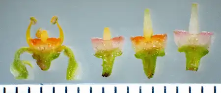 花の縦断面で示す。左から開花直後のオスの段階、雄しべが脱離した第一休止段階、雌しべが新調したメスの段階、そして雌しべも老化した最終段階。オスの段階とメスの段階だけオレンジ色を示し、他の段階ではピンク色をしている。花の中心にある柱状のものが雌しべ。