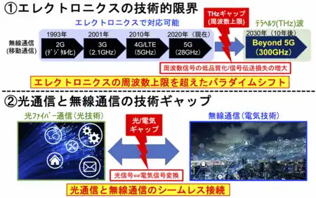 ・テラヘルツ波を用いる次世代移動通信では、これまで利用されてきた電気的手法が技術的限界(周波数上限)に達する可能性がある。