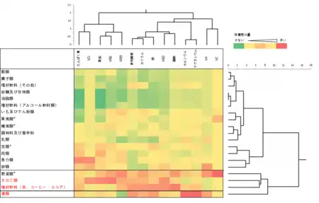 可食部100gあたりの栄養素の量を100kcalあたりに換算し、令和元年国民健康・栄養調査における大分類ごと(嗜好飲料類のみ詳細化)で食品群のクラスター解析を実施しました。WHOが摂取を促している果実類、野菜類、種実類、豆類には※を記しています。