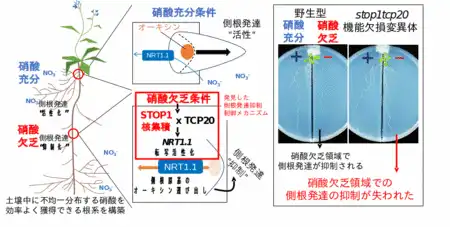 硝酸は土壌中に不均一に分布しています。植物は、硝酸濃度の低い土壌領域では側根の生育を抑制し、より高い領域で側根の発達を促進します。この応答は、植物が自らの限りあるリソースを用いて、硝酸濃度の高い領域で集中して硝酸を吸収することに貢献します。低硝酸領域での側根発達の抑制は、硝酸吸収を担う硝酸輸送体NRT1.1が中心的な役割を果たしていることが報告されています。NRT1.1は、硝酸が充分に存在する土壌領域では硝酸を輸送します。一方、硝酸欠乏領域では根の生育活性に関わる植物ホルモンであるオーキシンを側根形成の“場”である側根原基から運び出し、側根の形成と発達を抑制します(図)。しかし、低硝酸条件下における側根原基での NRT1.1 の遺伝子発現がどのように制御されているかは、これまで未解明でした。本研究は、シロイヌナズナの転写因子STOP1の機能欠損変異体が、低硝酸条件下において側根形成抑制が阻害されることを同定しました。詳細な解析の結果、 STOP1は低硝酸領域に生育する根の側根原基の核(DNAが格納される細胞小器官で転写産物合成の場)に集積し、 NRT1.1 のプロモーター領域 2)に直接結合することでその転写を活性化していました。また、これまでに報告されていた NRT1.1 の転写に関わる転写因子TCP20と相互作用し、STOP1-TCP20で協調的に低硝酸条件下での NRT1.1 の遺伝子発現を制御していました。そのため、STOP1とTCP20の両者の機能を欠損させた stop1tcp20 機能欠損変異植物体は、硝酸欠乏領域における側根形成の抑制がほぼ完全に失われます(図)。