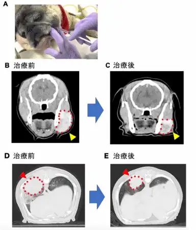 miR-634の腫瘍内局所投与治療を受けた1頭(症例番号1)では、原発病変および肺転移病変において顕著な腫瘍縮小効果が認められ、岐阜大学動物病院での通院外来治療により2年余りを飼い主のもとで暮らすことができました。