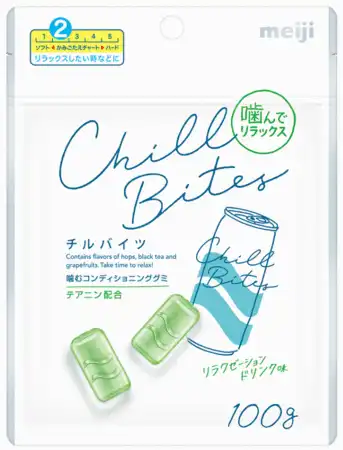 株式会社 明治(代表取締役社長:松田 克也)は、適度なかみごたえと、リラックスタイムを応援する“テアニン”を配合したリラクゼーションドリンク風味のグミ「チルバイツ」を2023年10月10日から全経路に拡大して発売します。