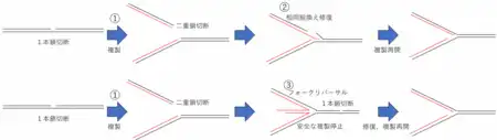 DNAは細胞内で代謝反応物などの影響で毎日多数のDNA損傷を受けている。DNA損傷の中でも、特にDNA二重螺旋のうちの一方の鎖が切れてしまう損傷(1本鎖切断)は最も頻繁に見られるものである。1本鎖切断損傷をもった鋳型鎖を複製すると、より重篤なDNA損傷として知られている二重鎖切断(DNA二重螺旋が両方とも切断した損傷)に発展する(図1 ①)。抗がん剤として使用されているカンプトテシンは、複製中に大量の1本鎖切断損傷を誘導する。がん細胞が通常細胞よりも頻繁に細胞分裂し活発に複製をしているため、がん細胞において複製に伴い二重鎖切断が大量発生し、がん細胞死を誘導できることがその治療原理となっている。