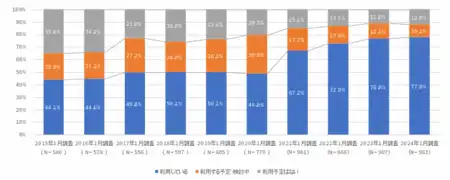 本調査では、2015年より電子契約の導入状況を調査しています。今年の結果では、すでに77.9%が電子契約を利用しており、前回調査(76.8%*)からは1ポイントの微増となりました。