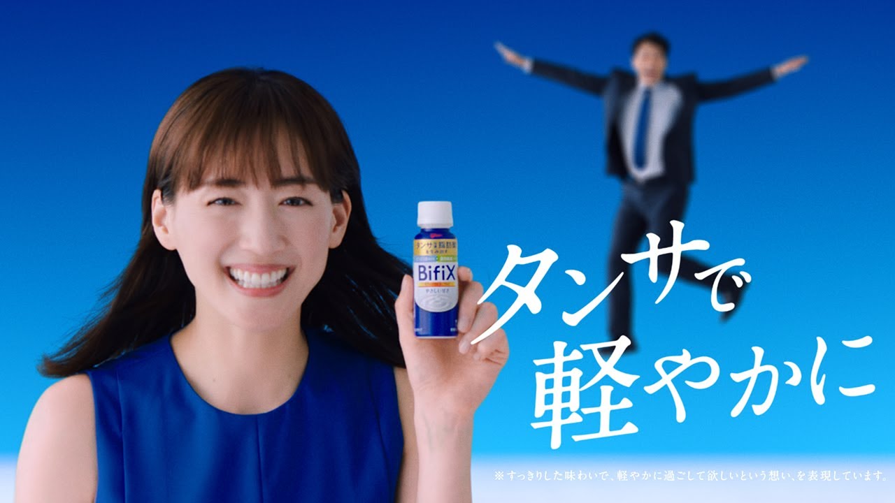 CMは、迫田さんがスーツを試着中にズボンのボタンが閉まらず、焦っている場面から始まる。突然、目の前の大型ビジョンに綾瀬さんが現れ、「あなたに、タンサ」と呼びかける。驚いた迫田さんが振り返ると、画面の中にいた綾瀬さんが迫田さんの背後にひょっこり現れ、「BifiXヨーグルトドリンク」を勧める……というストーリー。
