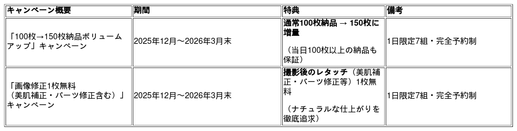 キャンペーン期間中は「100枚→150枚納品」または「画像修正1枚無料」をお得に選択できる絶好のチャンス。ぜひこの機会に“結果につながる写真”を手に入れてみてください。