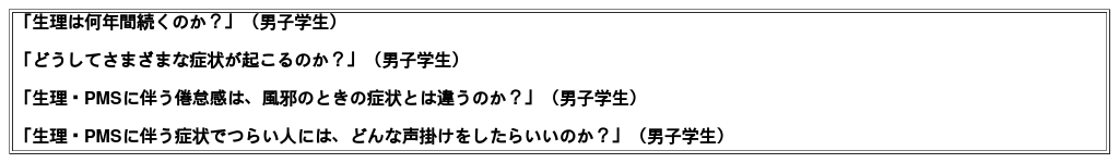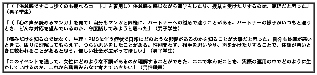 イベントの最後には、本イベントを企画した担当者と学生が展示を通して感じたこと等をディスカッションする時間も設けられ、意見が活発に行き交い、生理・PMSへの理解が一層深まったようです。以下のような感想がアンケートに寄せられました。