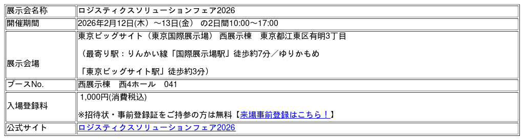 開催される「ロジスティクスソリューションフェア2026(以下、本展示会)」に出展します。