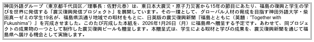 このたびの贈呈式では、学生たちが内堀福島県知事へ本紙を直接お渡しするとともに、同プロジェクトの成果物の一つとして制作した震災復興ビールも贈呈します。贈呈式後は、本紙をもとに本学の海外提携校への発信を予定しており、福島の現状や取り組み、人々の思いや挑戦を、学生の言葉で世界に伝えていくことを目指します。
