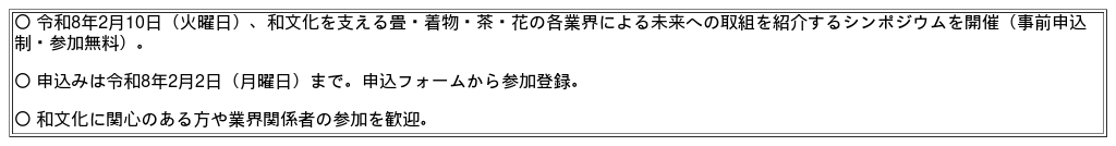 農林水産省は、和文化・産業連携振興協議会と連携し、令和8年2月10日(火曜日)に「和文化シンポジウム」を開催します。