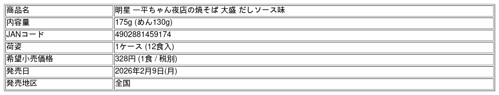 明星食品株式会社 (社長:豊留昭浩) は、カップ焼そば「明星 一平ちゃん夜店の焼そば 大盛 だしソース味」を、2026年2月9日(月) に全国で新発売します。