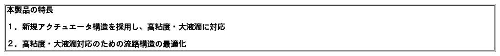 1.新規アクチュエータ構造を採用し、高粘度・大液滴に対応