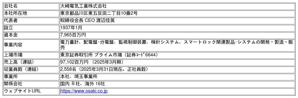 ・ 大崎電気工業株式会社 (本社: 東京都品川区、取締役社長執行役員COO:渡辺光康)