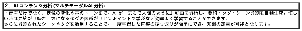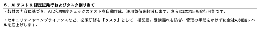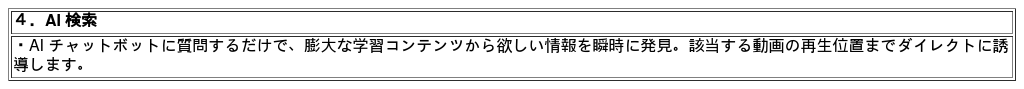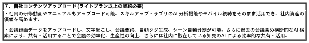機能:学習コンテンツ (見放題1,000本以上およびオプションコンテンツ)、AI コンテンツ分析、AI 学習プラン作成、AI 検索、モバイルアプリ、ダッシュボード、タスクの割り当て、AI テスト & 認定証発行、学習メモ、自社コンテンツアップロード (ライトプラン以上の契約必要)
