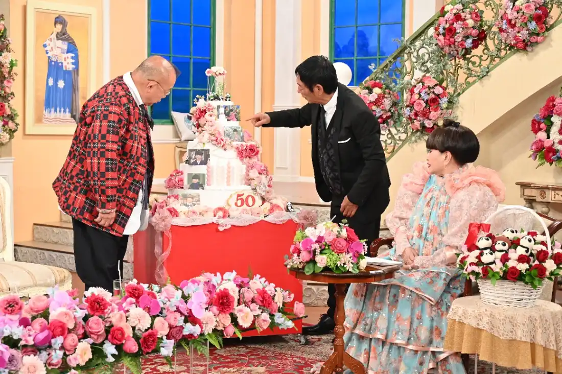 鶴瓶さんとさんまさんのブロックでは、恒例企画「カードトーク」で盛り上がるほか、50周年を祝うセレモニーを実施。2人からのサプライズとして、スタジオには黒柳さんの偉業をたたえる5段の特製ケーキが登場する。1976年の初回放送をはじめとした黒柳さんの写真や、黒柳さんが愛するパンダとバラのデコレーションが施されており、黒柳さんは「すごい!すごい!」と大喜びする。