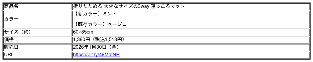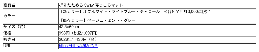 株式会社赤ちゃん本舗(本社:大阪市中央区 http://www.akachan.jp)は、アカチャンホンポ オリジナル商品の「折りたためる 3way 寝っころマット」より数量限定※2の新カラーを全国のアカチャンホンポとオンラインショップ(https://shop.akachan.jp)にて2026年1月30日(金)から販売いたします。おふろタイムの赤ちゃんの洗い場や待機場所、お着替えに活躍するほか、おむつ替えやアウトドアにもご利用いただけます。