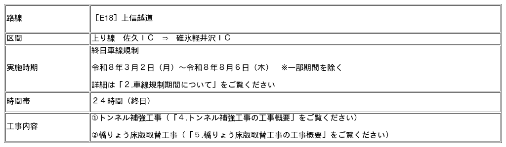 NEXCO東日本 長野工事事務所(長野県長野市)は、[E18]上信越自動車道(以下「上信越道」) 佐久(さく)インターチェンジ(以下「IC」)から碓氷軽井沢(うすいかるいざわ)IC間の上り線において、老朽化した閼伽流山(あかるさん)トンネルおよび和美沢(わみさわ)橋のリニューアル工事に伴う終日車線規制を実施します。お客さまにはご迷惑をおかけしますが、規制区間内では速度制限を遵守いただき、安全運転にご協力をお願いします。