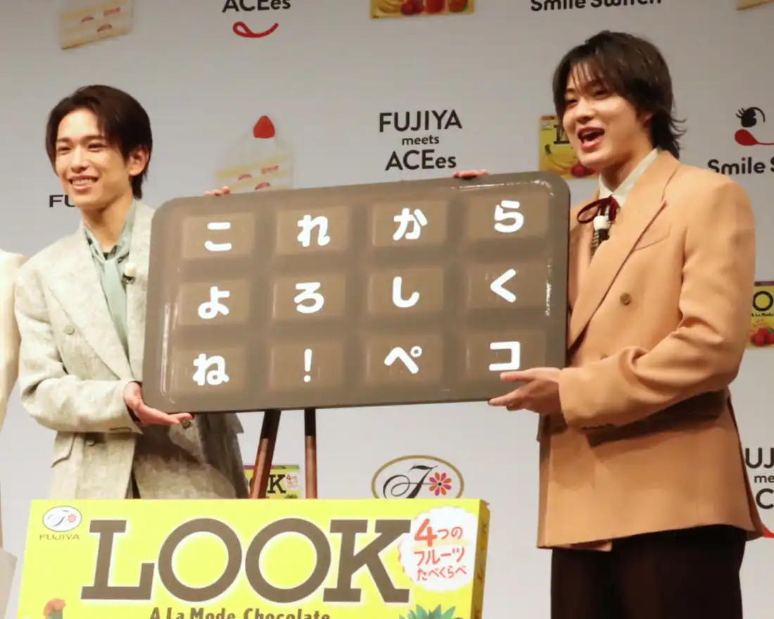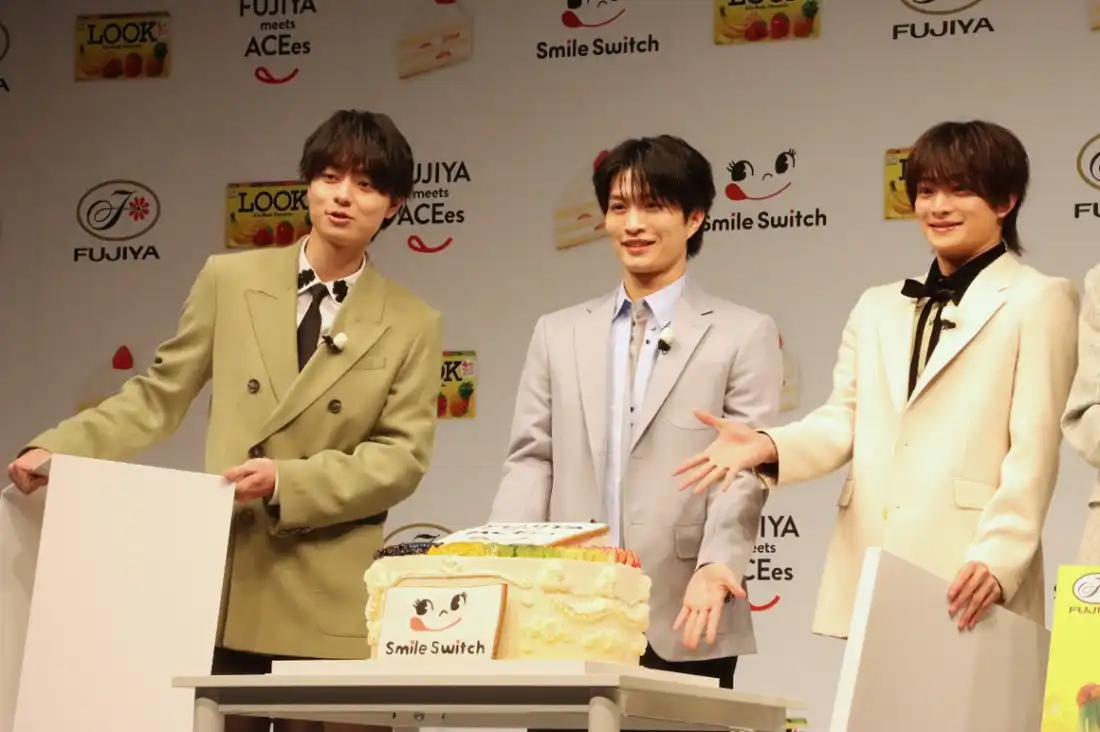 ジュニアの人気グループ「ACEes(エイシーズ)」が不二家の「Smile Switch(スマイル・スイッチ)」ブランドキャラクターに起用され、2月2日、東京都内で行われた発表会に出席した。浮所飛貴さんは、「100年以上愛されている不二家さんのブランドキャラクターに就任できることはとても光栄」といい、「本当にうれしかったんですけど、同時にめちゃくちゃ驚きました」と語り、「不二家さんに負けないぐらい甘いフェイスを皆さんに見ていただいて、たくさんの甘さを味わってほしい」と呼びかけた。