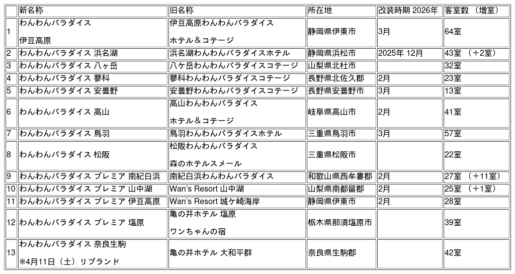 日本全国184棟のホテル・旅館を運営するアイコニア・ホスピタリティ株式会社(本社:東京都港区、代表取締役会長:山本俊祐、代表取締役社長:代田量一、以下当社)の【愛犬と泊まれるホテル】の13棟は、2026年2月11日(水・祝)「わんわんパラダイス」・「わんわんパラダイスプレミア」へ統合してリブランドをいたします。このたびのリブランドを機に、マスコットの「ボブ・ワンワン」が登場。当社では、かけがえのない家族であるワンちゃんとの旅をボブ・ワンワンとともに、今後もより一層応援いたします。また、【愛犬ファーストのリゾートで、最高の思い出をつくる情報サイト】を昨年12月にリリースし、ワンちゃんとの旅の情報をお届けしています。