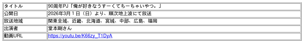 また、本商品発売に伴い、アーティスト堂本剛さん出演の新CM「90周年PJ俺が好きなうすーくてちーちゃいやつ。篇」を3月1日(日)より全国で順次放映を開始します。CM制作時にも堂本剛さんよりアドバイスをいただき、インパクトあるパッケージにフォーカスした撮影、編集をおこないました。CMのラストではパッケージの中の堂本剛さんが笑顔で「好きやねん」と一言伝える印象的な演出となっています。