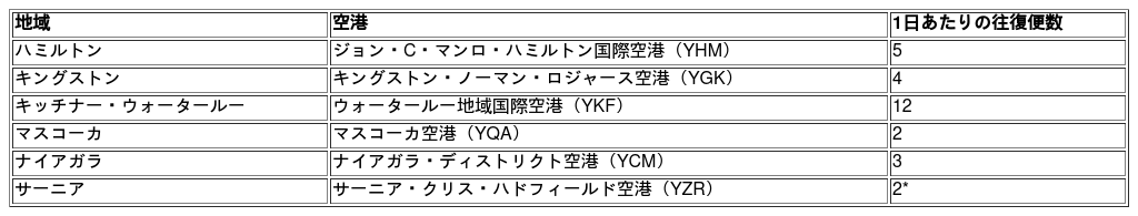 * サーニア発着サービスは、ウォータールー地域国際空港(YKF)を経由して運行されます。
