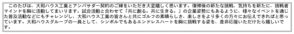 当社は2012年より大山志保選手と、2024年より桑木志帆選手、浜崎未来選手、宮里優作選手と所属契約を締結していますが、大和ハウスグループのシンボル「エンドレスハート」を身に付けて挑戦する所属選手とともに森田理香子選手も全力でサポートし、スポーツで生み出される感動や勇気を通じて、多くの生きる歓びを共に創出してまいります。